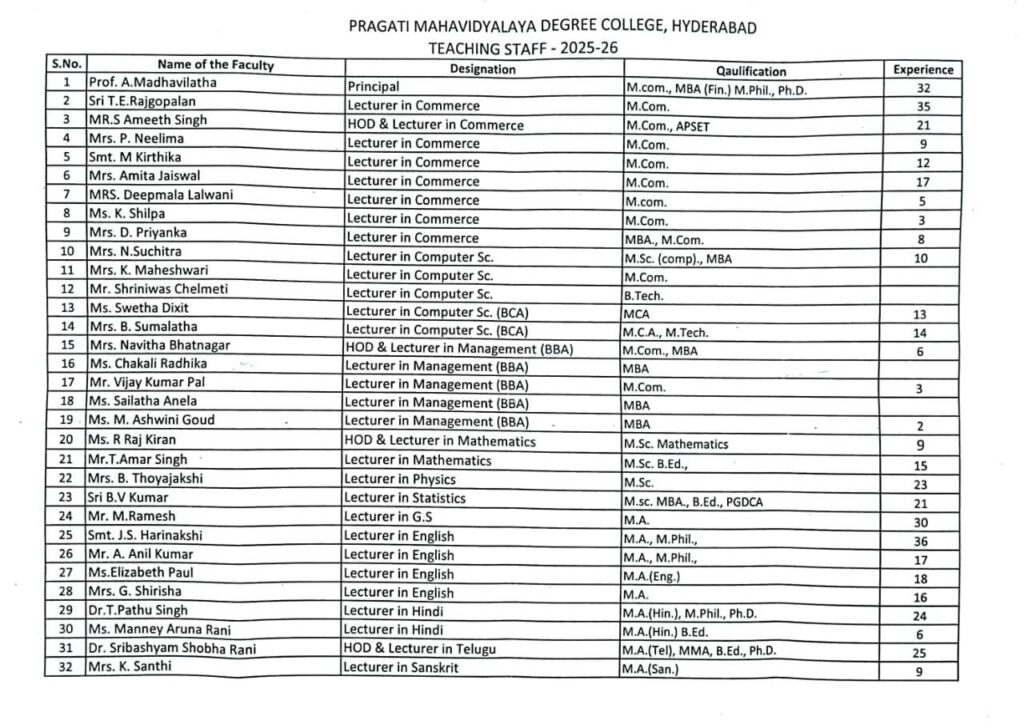 Pragati Mahavidyalaya being one of the oldest educational institution of the twin cities of Hyderabad and Secunderabad has an illustrious list of alumni. The college takes pride in mentioning that Shri Y.S. Jagan Mohan Reddy, Chief Minister of Andhra Pradesh. Brij Bala Krishnan, Col. Naveen Reddy, Shri Devraj Reddy, former ICAI Chairman, etc., are the alumni of the College.