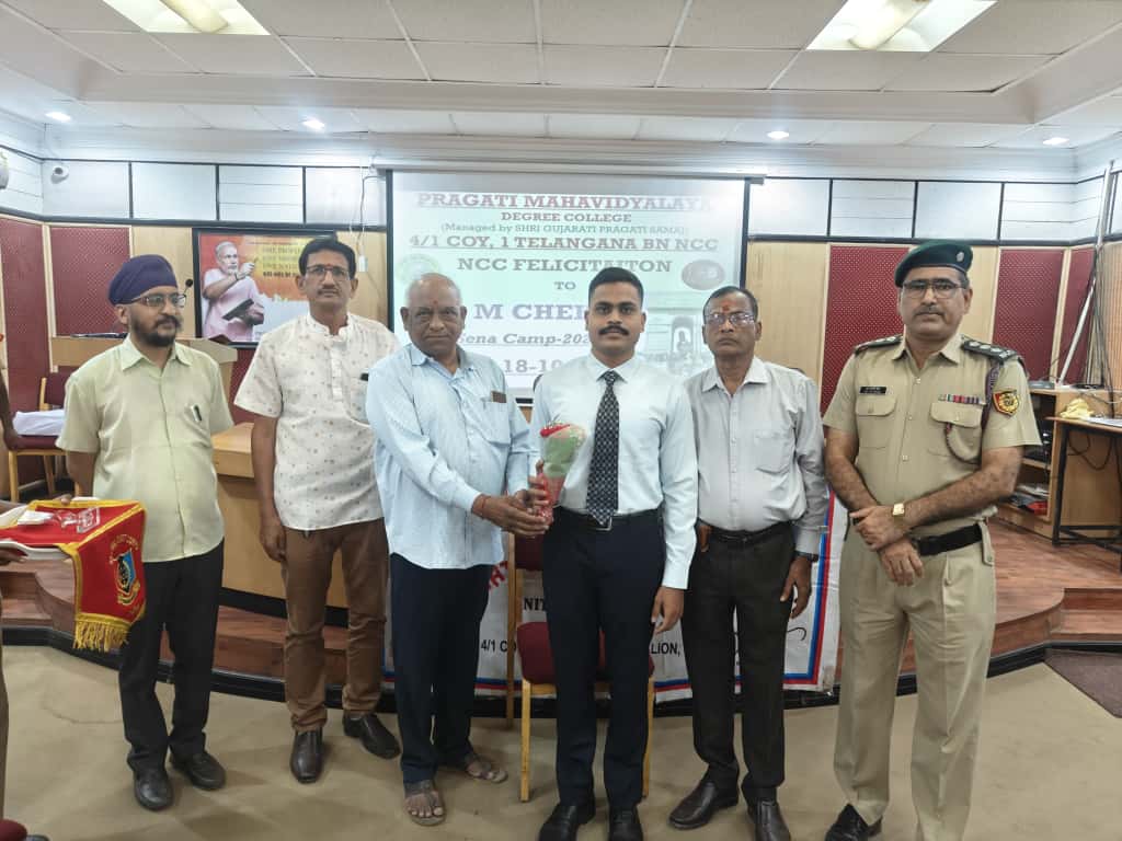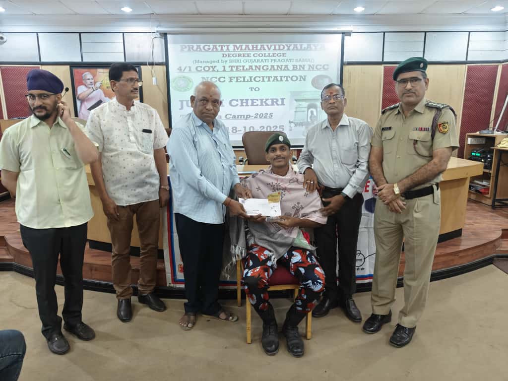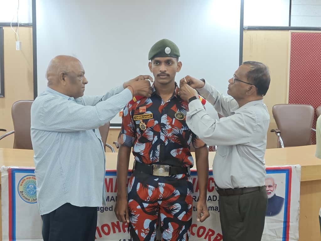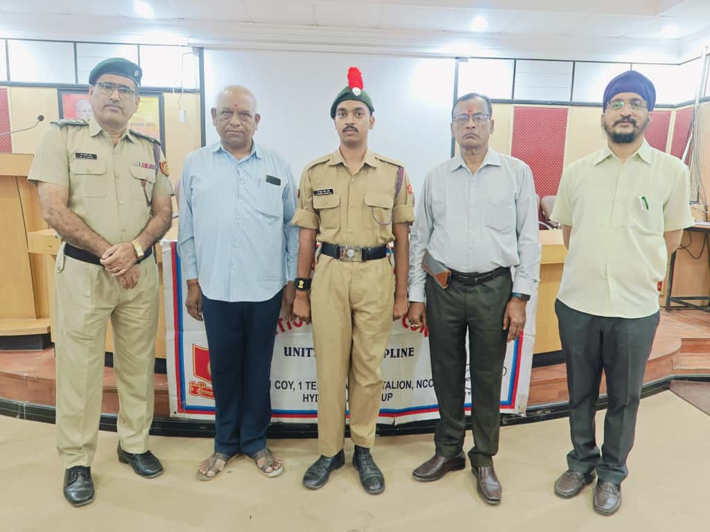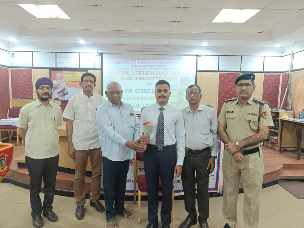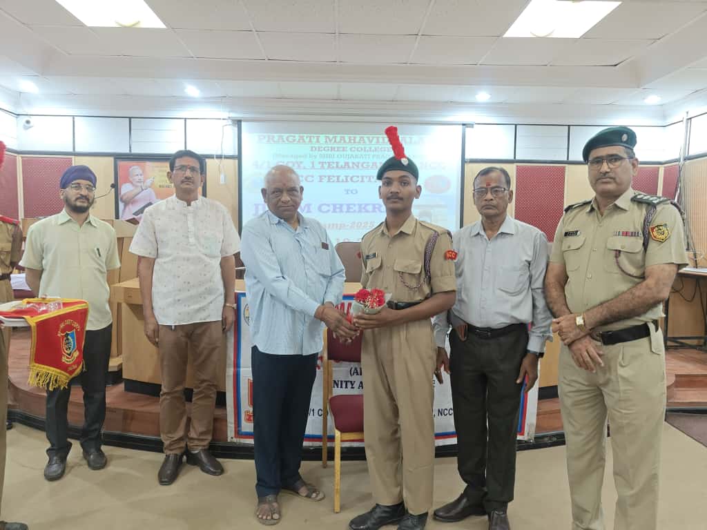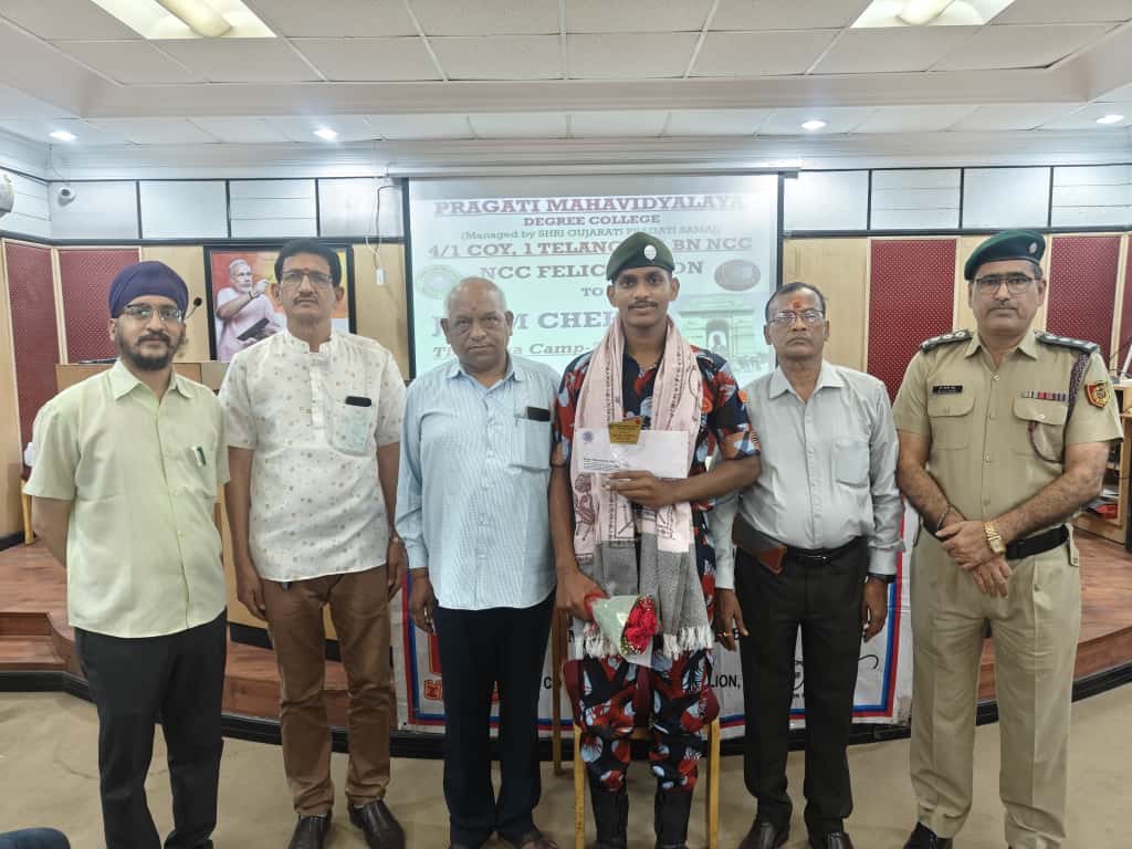 JUO M CHEKRI who attended prestigious All India Thal Sena Camp, New Delhi-2025 was felicitated by 4/1 COY, 1 Telangana Bn NCC, PMV College. Correspondent Shri Gopal Patel ji was attended as Chief guest.