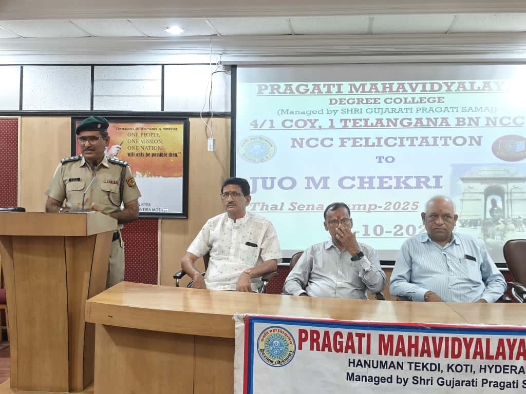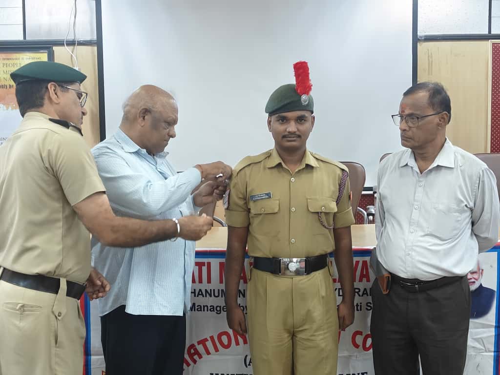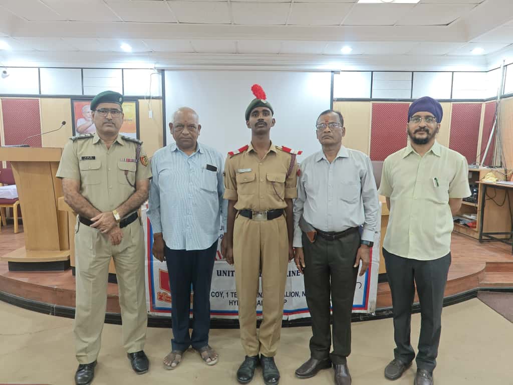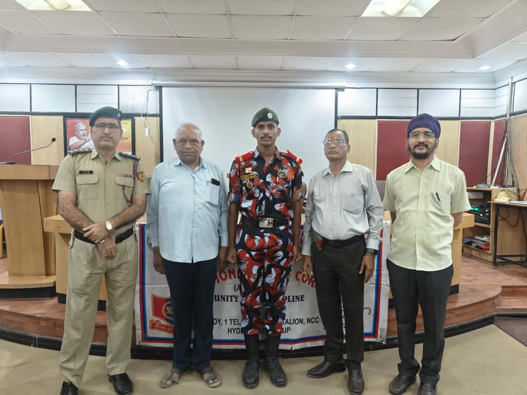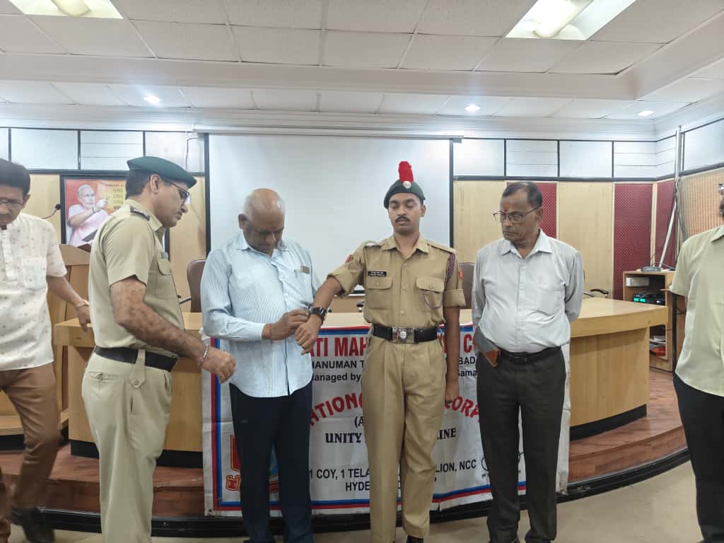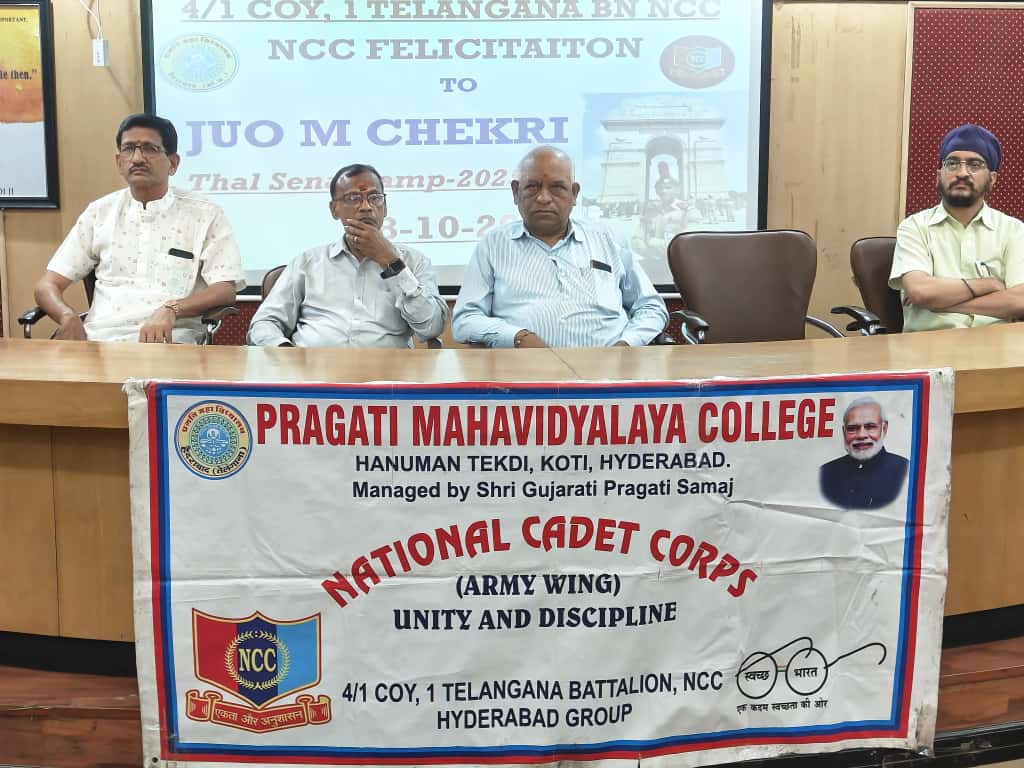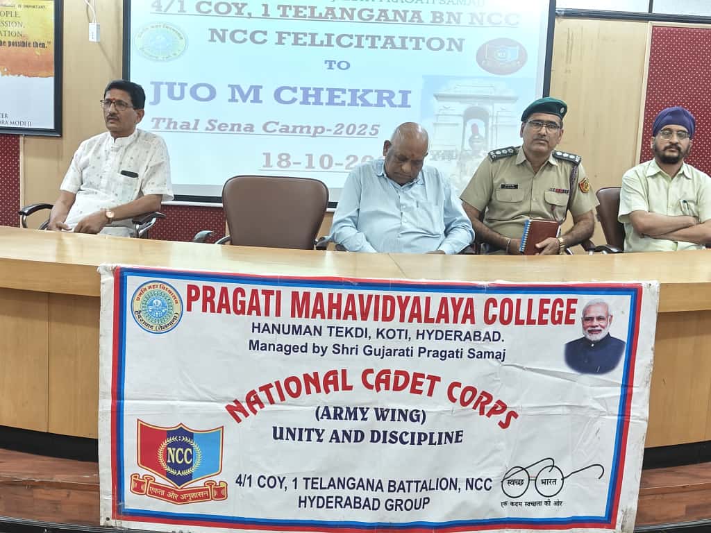 JUO M CHEKRI who attended prestigious All India Thal Sena Camp, New Delhi-2025 was felicitated by 4/1 COY, 1 Telangana Bn NCC, PMV College. Correspondent Shri Gopal Patel ji was attended as Chief guest.