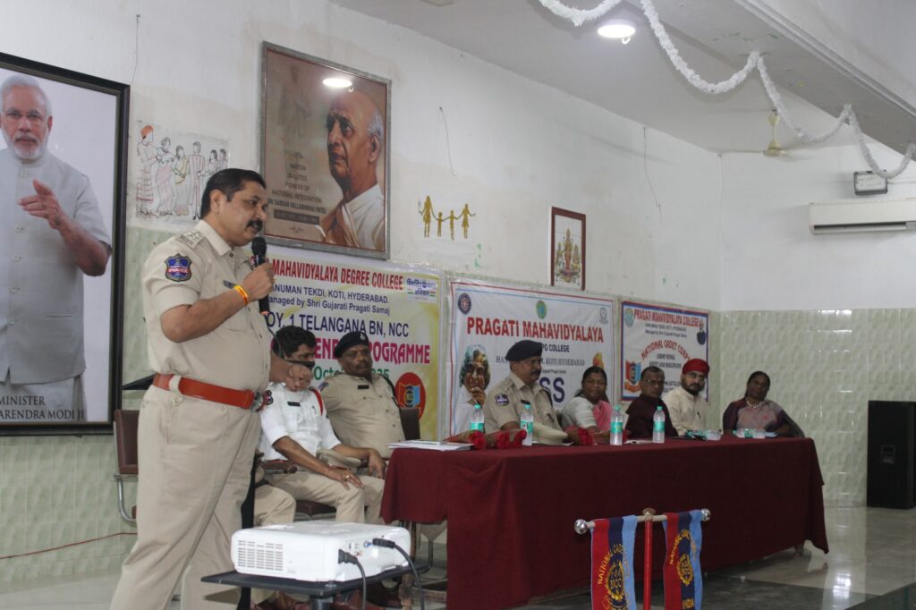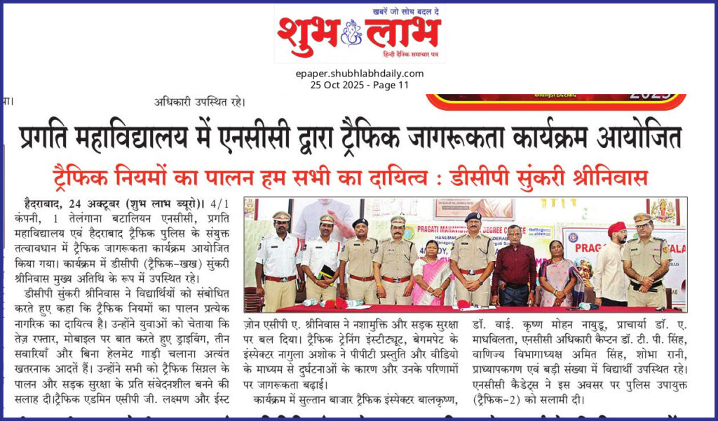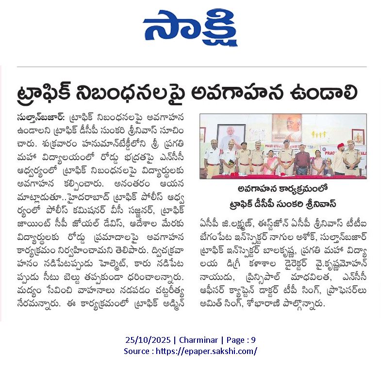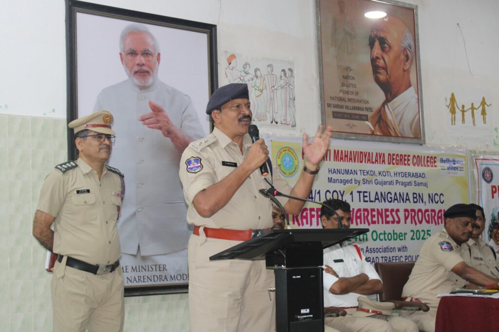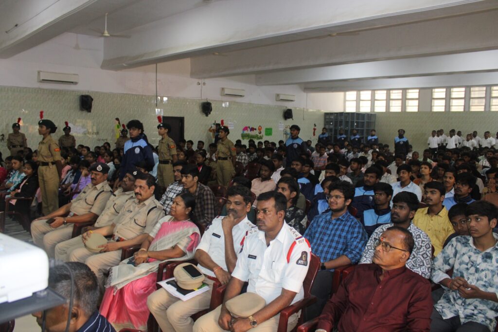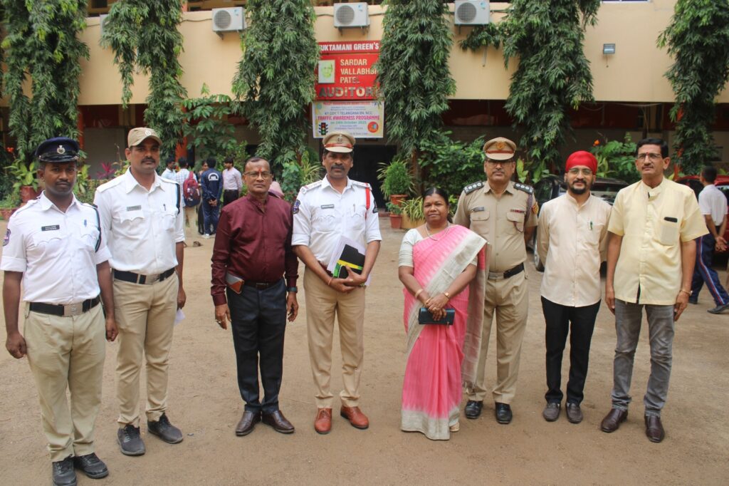 Traffic Awareness Programme organised by College NCC COY on 24 Oct 2025. Traffic DCP Sunkari Srinivas garu attended as Chief Guest, ACPs Sri G Laxman garu & A Srinivas garu, inspectors, Principal, PG Director were present in the same.