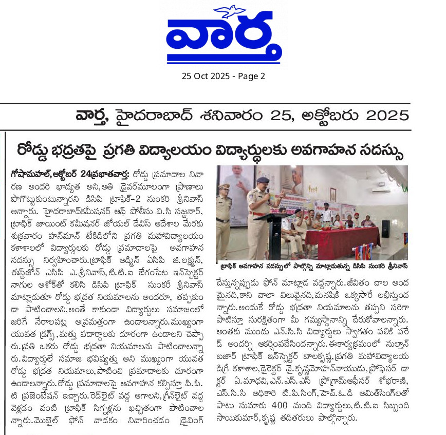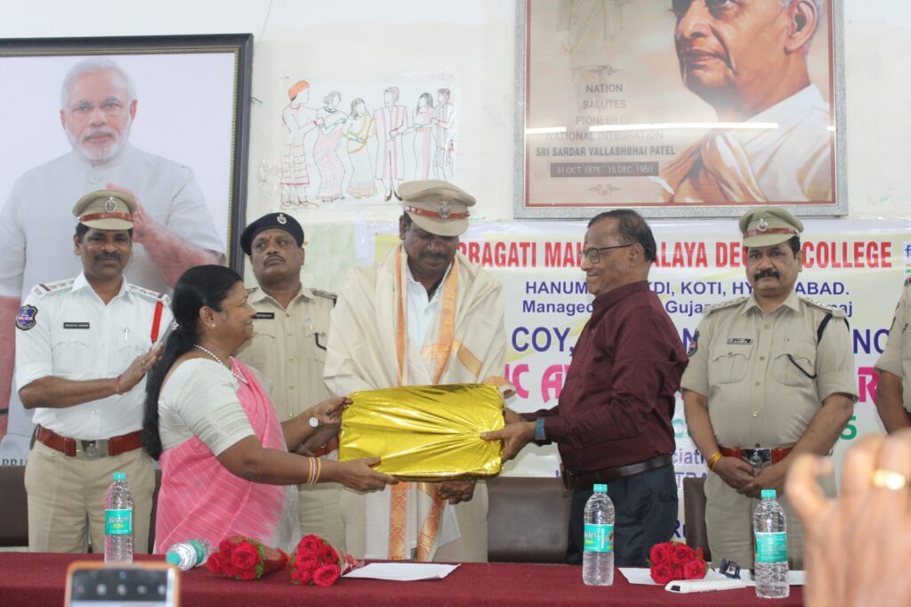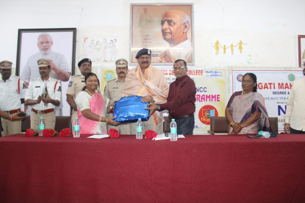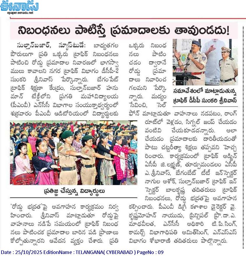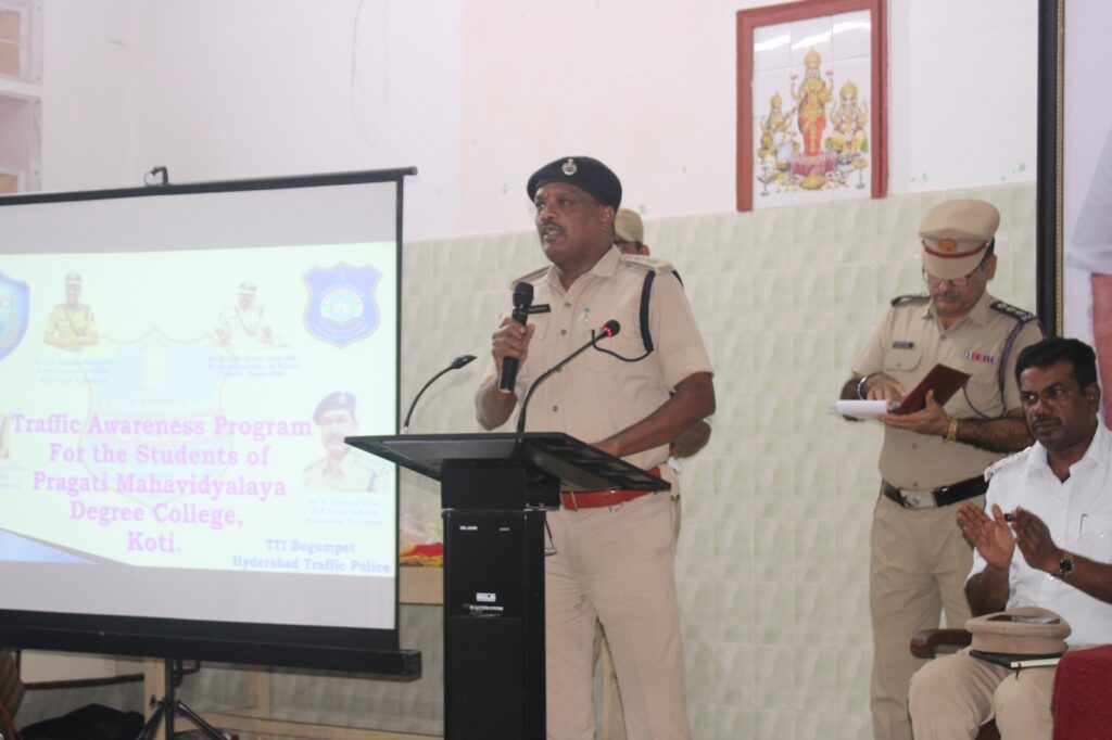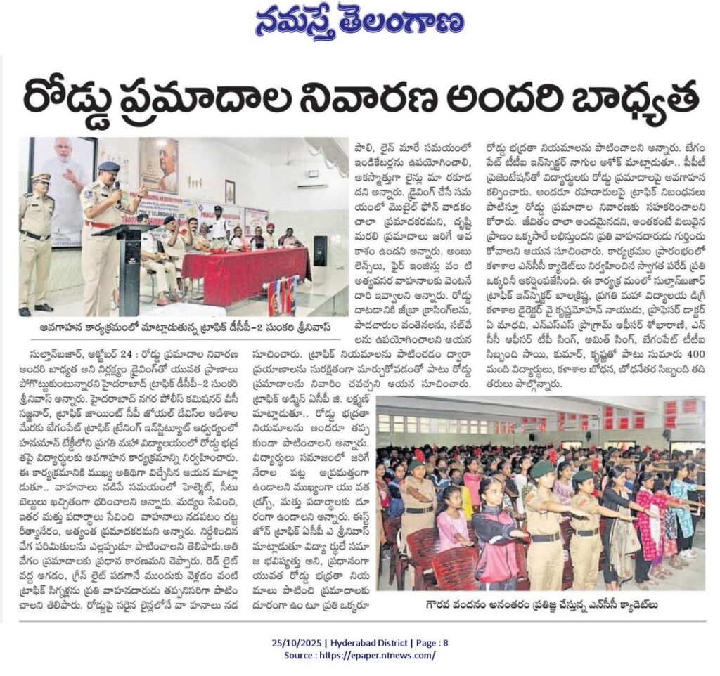 Traffic Awareness Programme organised by College NCC COY on 24 Oct 2025. Traffic DCP Sunkari Srinivas garu attended as Chief Guest, ACPs Sri G Laxman garu & A Srinivas garu, inspectors, Principal, PG Director were present in the same.